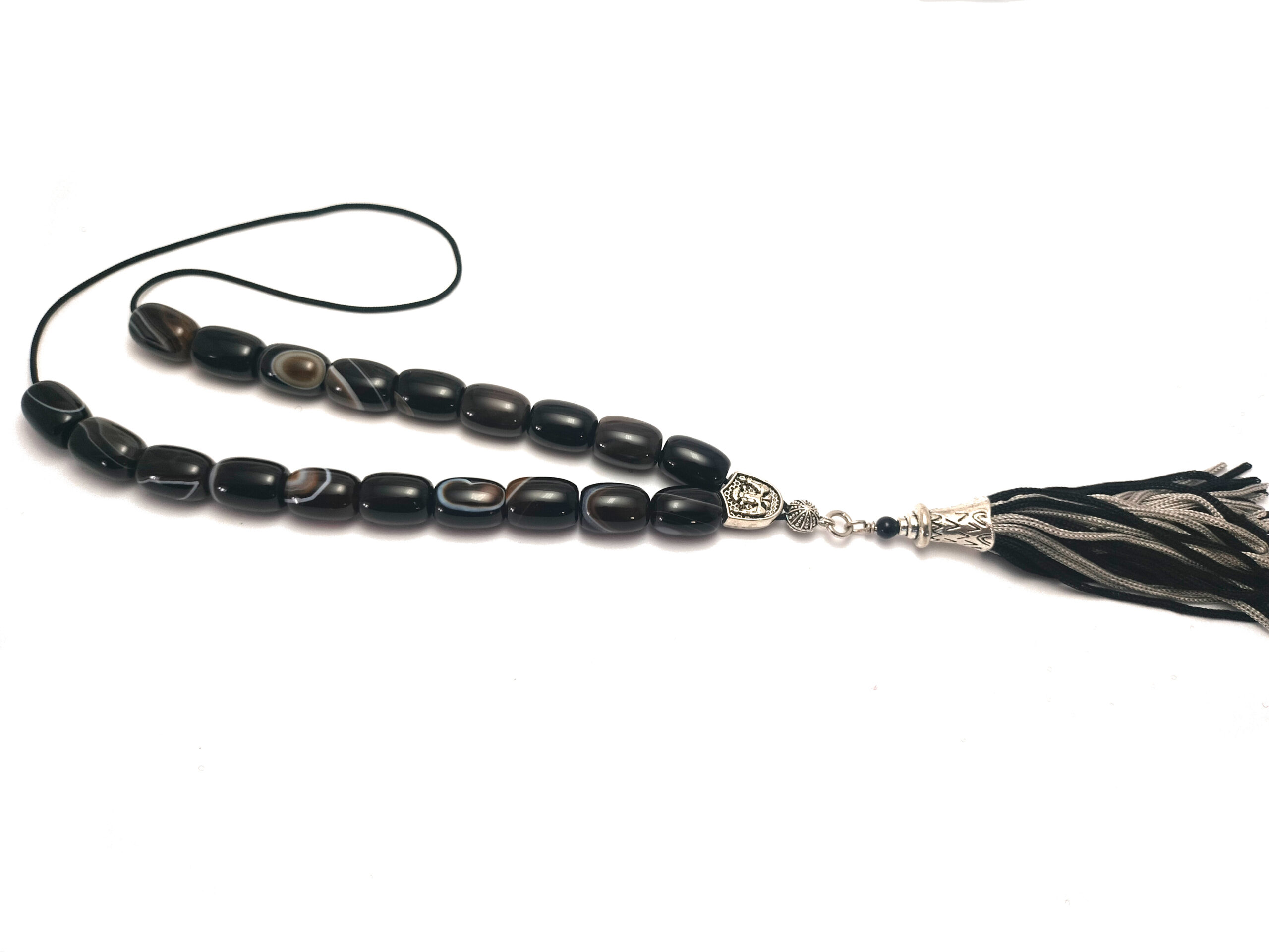 Κομπολόι αχάτης 19 χάνδρες (διάμετρος 14×10) μαύρο ριγέ με φούντα